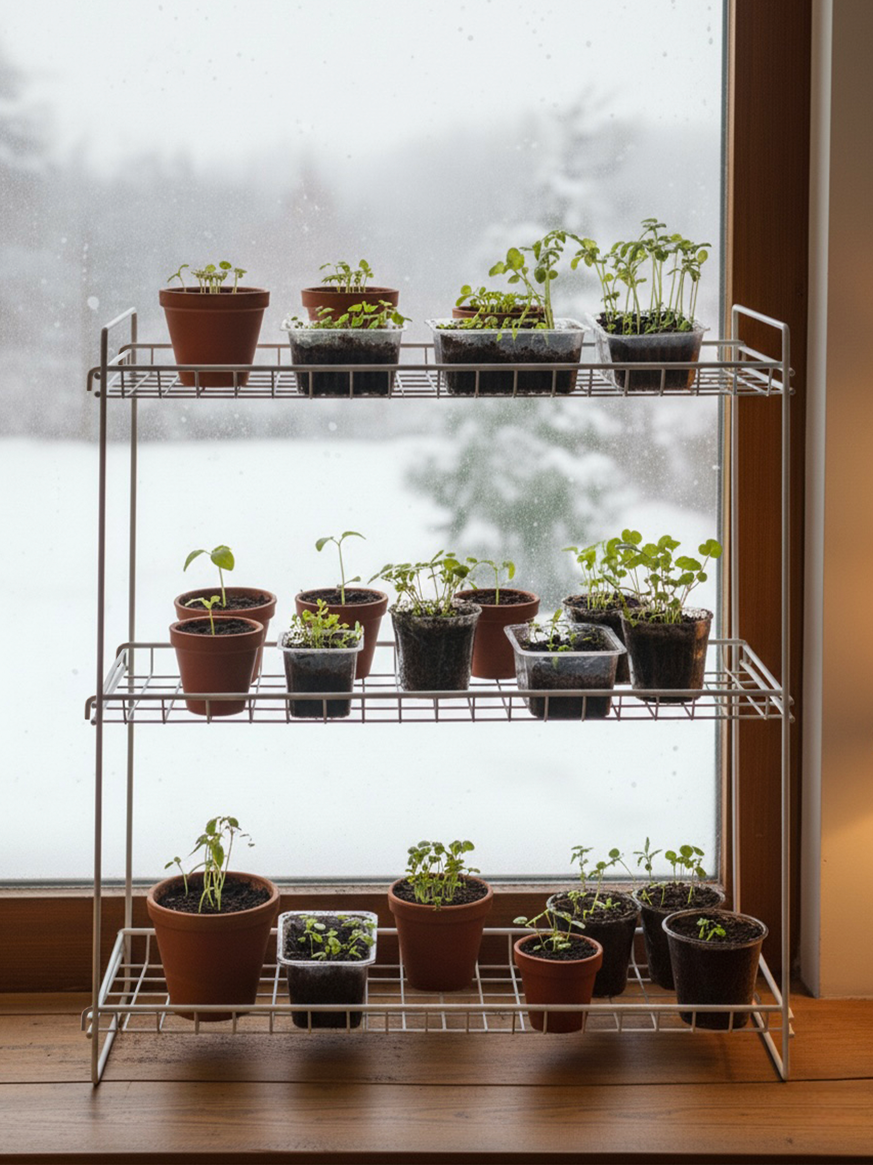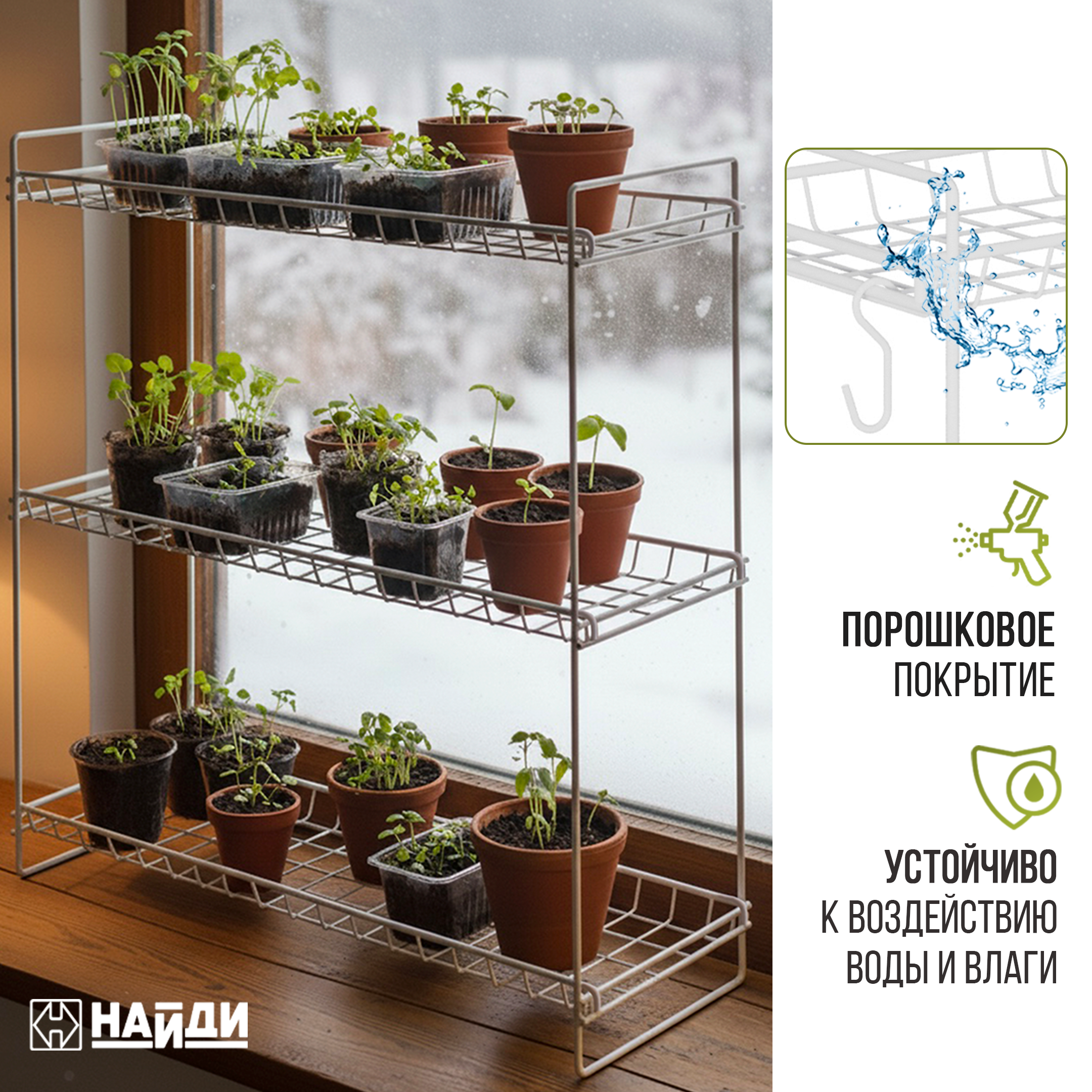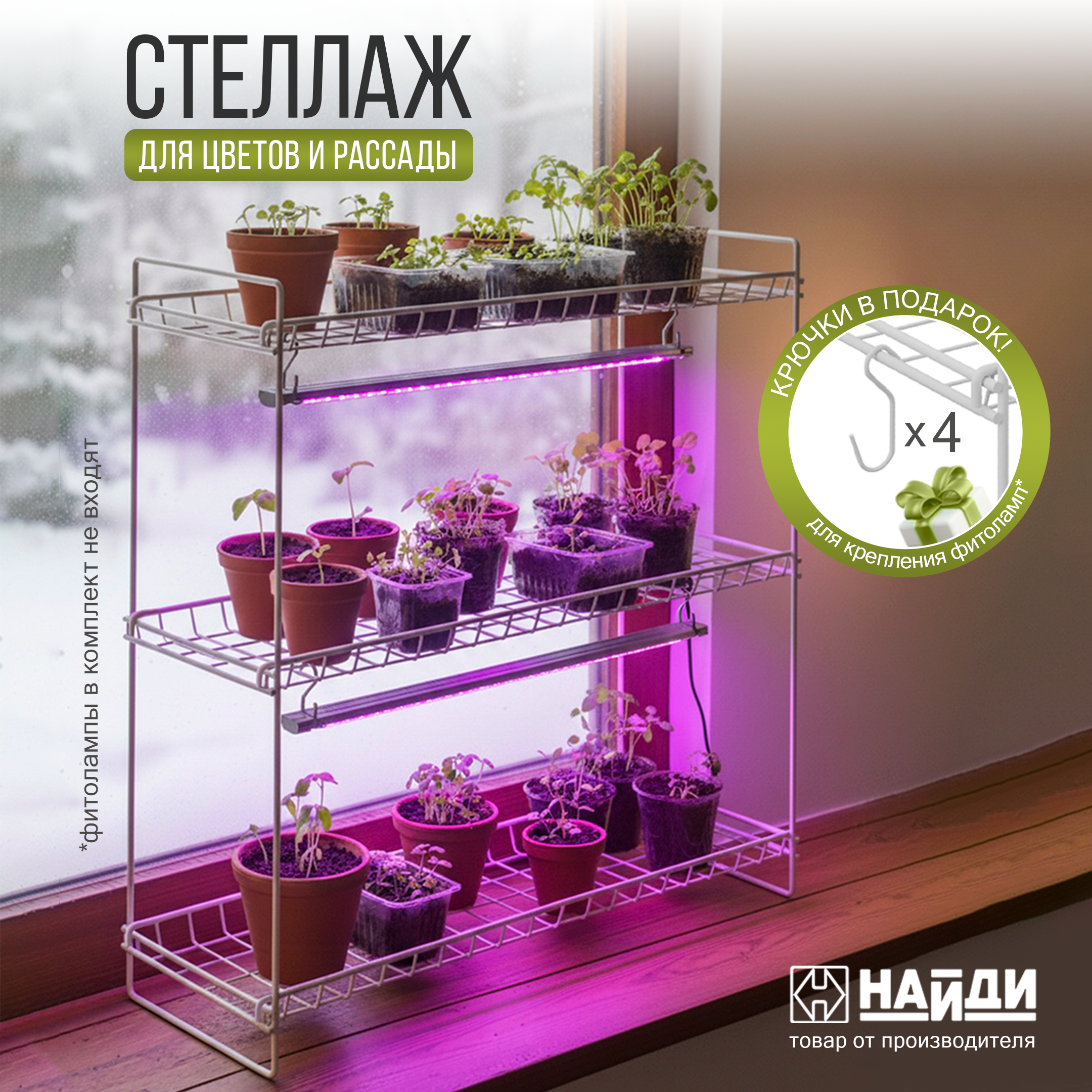 Стеллаж для рассады ЭКО прочный, легкий, качественный. Изготовлен из стальной проволоки с полимерно-порошковым покрытием, которое защищает изделие от влаги, ржавчины, придает эстетики внешнему виду. На 3х полочках можно разместить горшочки, стаканчики с рассадой. Кроме того стеллаж можно использовать для цветов на окне. В комплект входят крючки для крепления фитолампы.
